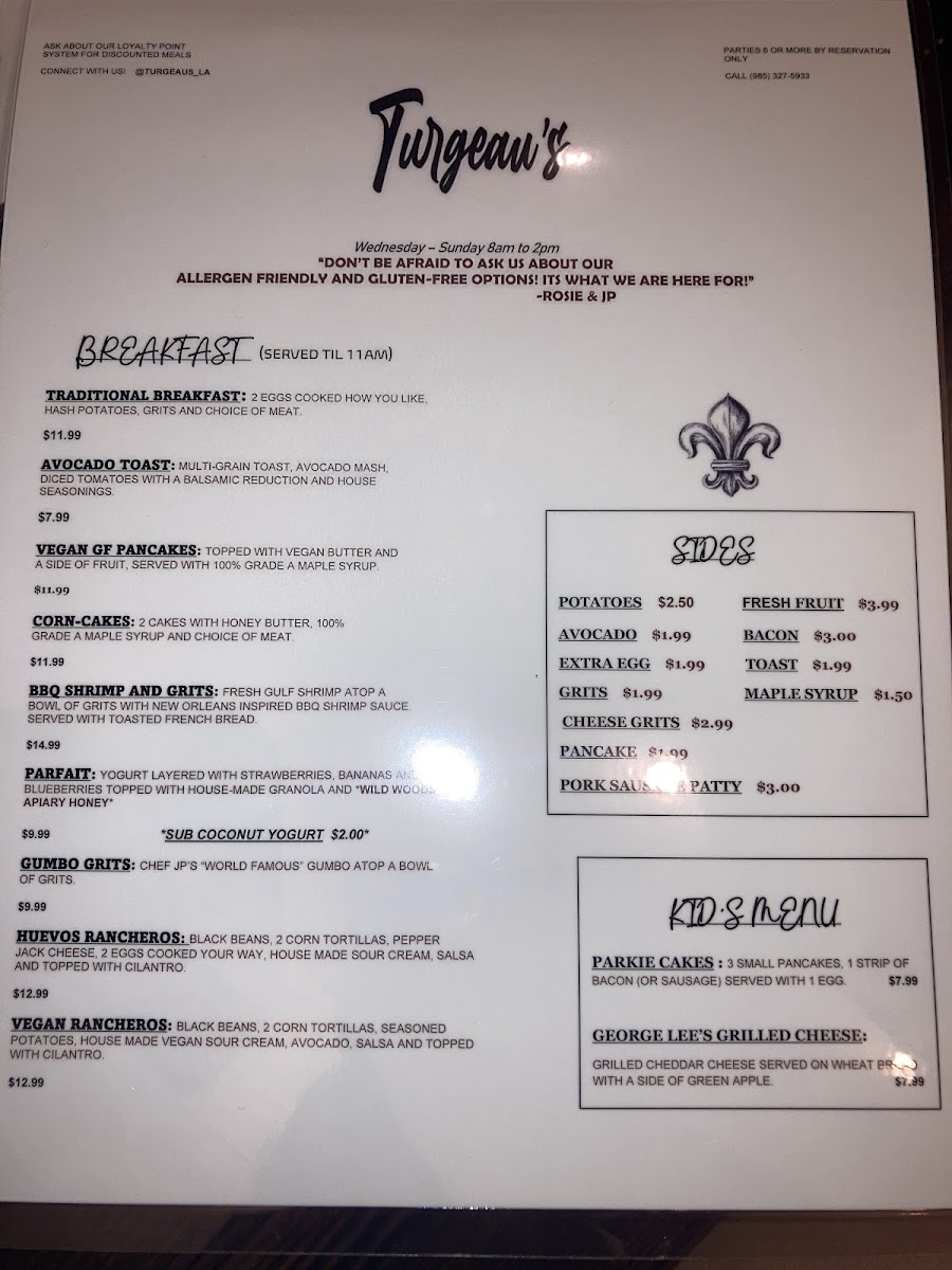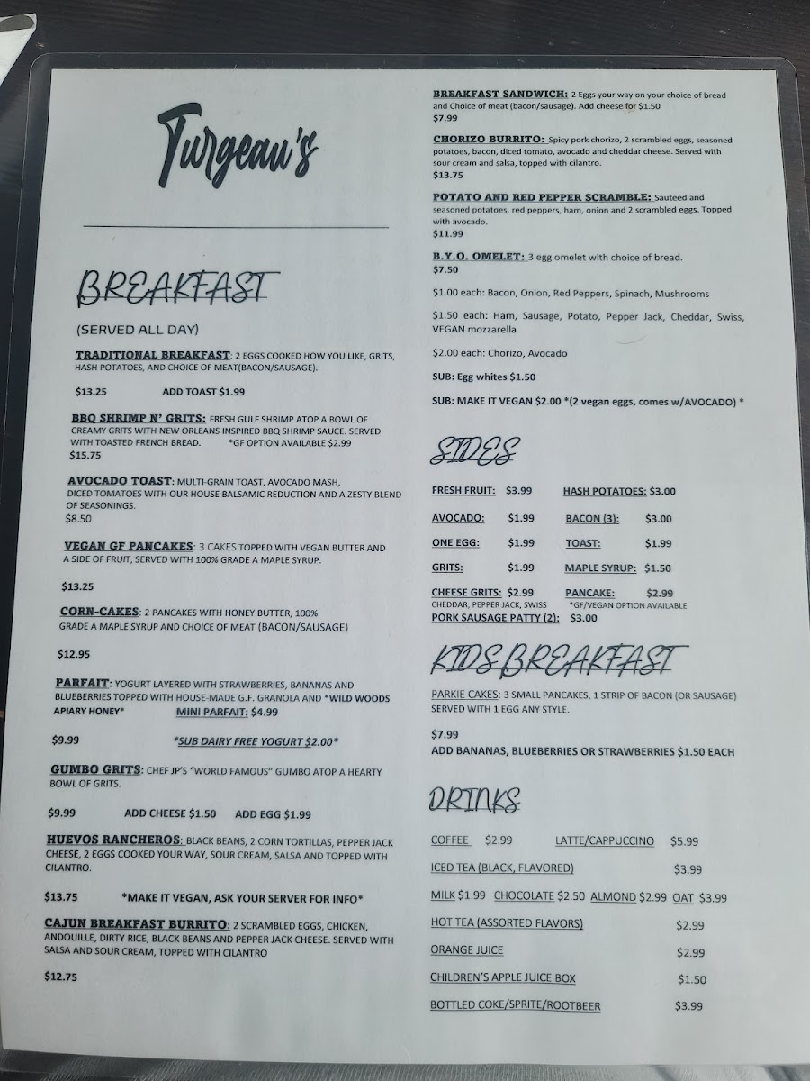 Welcome to Turgeau's, a hidden gem nestled in Covington, LA, where culinary excellence meets homemade charm. This unique restaurant showcases a delightful fusion of Mexican and Louisiana-inspired dishes, promising an unforgettable dining experience. With an inviting atmosphere, ample seating, and a staff that exudes warmth and attentiveness, Turgeau's is perfect for both family gatherings and intimate meals.